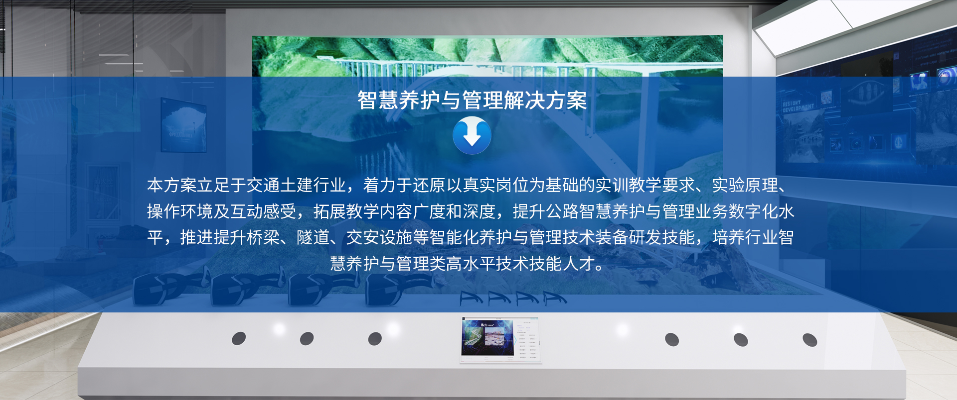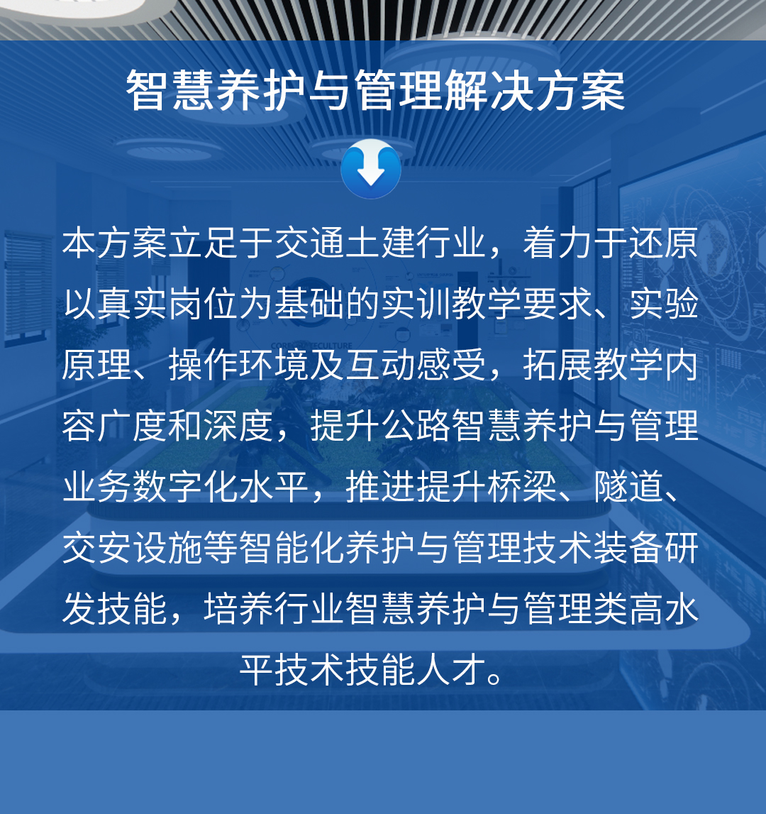 本方案立足于交通土建行业,着力于还原以真实岗位为基础的实训教学要求、实验原理、操作环境及互动感受,拓展教学内容广度和深度,提升公路智慧养护与管理业务数字化水平,推进提升桥梁、隧道、交安设施等智能化养护与管理技术装备研发技能,培养行业智慧养护与管理类高水平技术技能人才。
